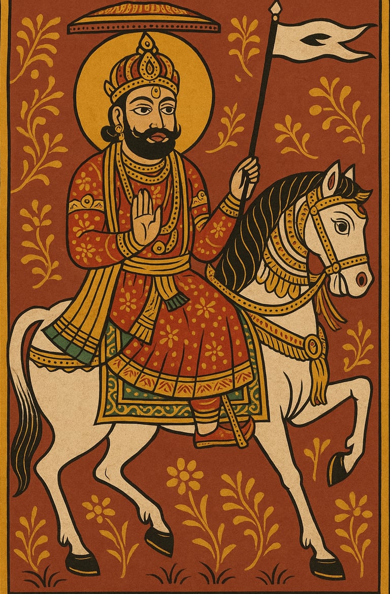 Baba Ramdevji Tanwar, also revered as Ramdev Pir or Ramapir, was a 14th-century saint and social reformer born around 1409 CE in Runicha, near Pokhran, Rajasthan. He descended from the illustrious Tanwar (Tomar) Rajput dynasty, whose ancestor King Anangpal Tanwar ruled Delhi around 1100 A.D. His father, Ajmalji Tanwar, became ruler of Pokhran, and his mother, Mainalde Bhati, belonged to the noble Bhati clan of Jaisalmer. The divine couple were blessed with two sons — Viramdevji and Ramdevji. From childhood, young Ramdevji displayed extraordinary compassion, miracles, and a deep commitment to justice and equality.
